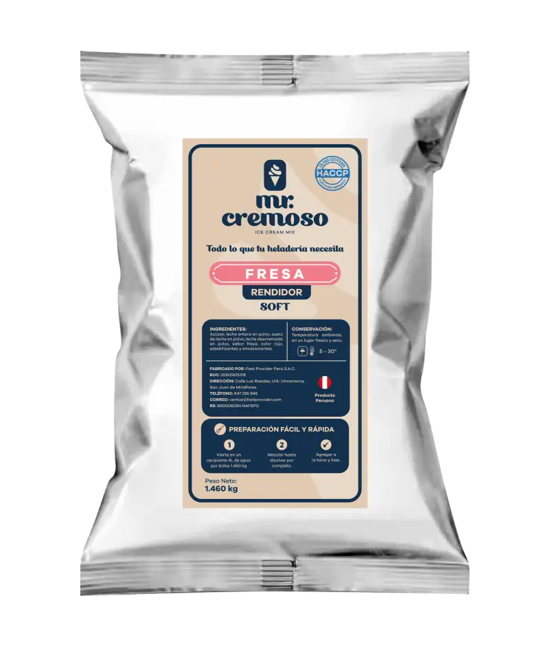 Base de helado compatible con cualquier maquina de helado soft, de fácil preparado: Solo requiere 3 Litros de agua bebible, licuarlo sin dejar grumos y listo! Cada bolsa te puede rendir hasta 60 conos.